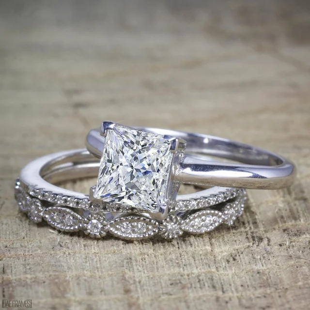 A perfect handmade Wedding Trio Ring Set, comes with Main solitaire engagement ring, and 2 matching art deco wedding bands. The beautiful bridal trio set is the perfect design for her. The collect of 3 Rings, the trio ring set is affordable and now available on sale price for limited time. The beautiful princess solitaire engagement ring is surrounded with 2 vintage style art deco wedding bands. Hand carved and designed, the perfect wedding ring set for her.