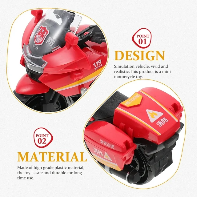 -Color:White, Red -Material:Plastic -Size:12.50X8.00X6.50cm/4.91X3.14X2.55in -Made of high grade plastic material, the toy is safe and durable for long time use. -The no battery design make it an energy-saving and environmentally friendly toy. -It's easy to play and it will make an amazing time for parents to interact with toddlers. -The simulation motorbike toy is also can cultivate children cognition while playing. -A great gift for kids on their birthday, new year or daily life. They will like it very much.