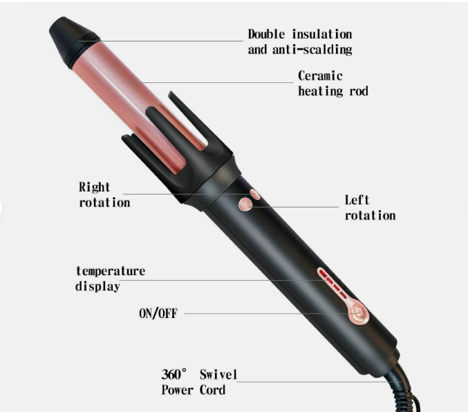 Voltage: 110-240V Frequency: 50/60Hz Power: 34W Fever: PTC Thermal Conductor Material: Aluminum Alloy Ceramic Coating Heat conduction diameter: 21-30 mm Four-stage temperature control, 140-160-180-200 Power cord length: about 1.8 meters, 360 degrees rotation, 60 minutes automatic power off, normally 55 revolutions per minute