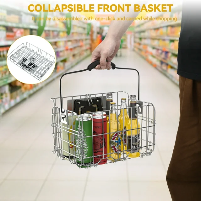 The front basket is foldable and detachable which can be carried for shopping with just one click of disassembly; The rear basket has a strong structure and large capacity of 50 pounds, making it great for holding groceries or even your pets.
