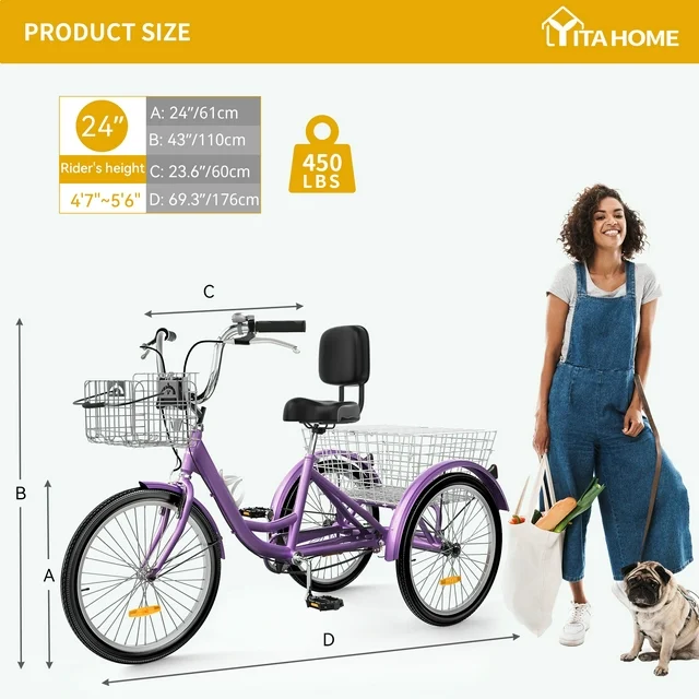 • THE RIGHT SIZE:The 24" adult tricycle is constructed with high-quality steel and a sturdy frame, making it suitable for both men and women who are 4'7"to 5'6"tall; Additionally, it has a total load-bearing capacity of 450 pounds