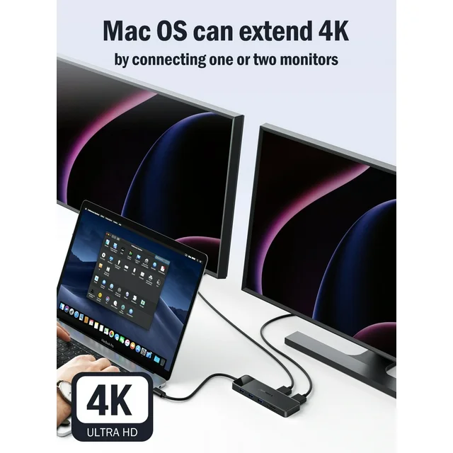 【4K HDMI to USB C Hub】2 HDMI ports of this hub supports up to 4K@30Hz, which can perfectly mirror or expand your screen to HDTV, monitor, projector.