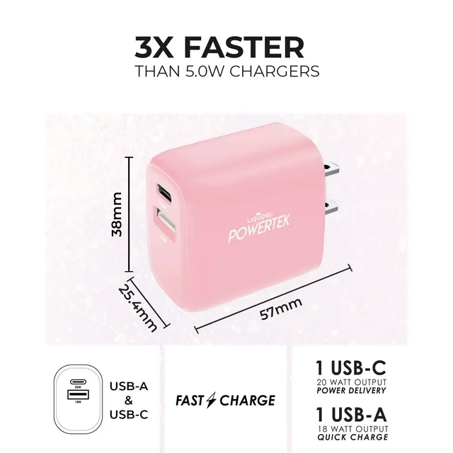 Liquipel Powertek Pastel Type-C Fast Charging Wall Charger 20W PD USB-C with Foldable Plug, for iPhone, iPad, iWatch, Galaxy, Tablet