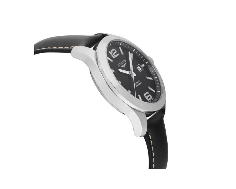 Stainless steel case with a black leather band. Fixed stainless steel bezel. Black dial with luminous silver-tone hands and index hour markers. Arabic numerals mark the 6 and 12 o'clock positions. Minute markers around the outer rim. Dial Type: Analog. Luminescent hands and markers. Date display at the 3 o'clock position. Longines calibre L619/888 automatic movement, based upon ETA 2892, containing 21 Jewels, bitting at 25200 vph, and has a power reserve of approximately 64 hours. Scratch resistant sapphire crystal. Screw down crown. Solid case back. Round case shape. Case size: 41 mm. Case thickness: 11.5 mm. Band width: 21 mm. Fold over clasp with a push button release. Water resistant at 300 meters / 1000 feet. Functions: date, hour, minute, second. Conquest Series. Dive watch style. Watch label: Swiss Made. Longines Conquest Black Dial Automatic Men's Watch L3.777.4.58.0.