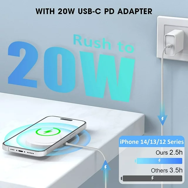 A Type-C 20W PD adapter brings fast charging speed, fully charged only needs 2-2.5H, It's faster than that of the original 5W Compatible with iPhone charger, and the charging pad compatible with iPhone 15/ 14/13/12 series models, and other wireless devices(Compatible with iPhone 8-11series).