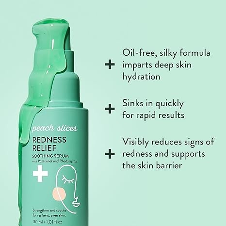• Peach Slices Redness Relief Soothing Serum visibly strengthens and soothes for skin that's resilient and calm. A healthy blend of soothing panthenol, artemisia, cica and rhodomyrtus combined with hydrating hyaluronic acid reduces the appearances of redness and irritation.