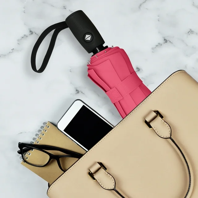 You never know what Mother Nature has in store — always be prepared with the Repel Travel Umbrella. Built to withstand the elements, the black umbrella features 9 reinforced ribs that are sturdy, durable, and tough; keeping you protected through the heaviest of rain, snow, and wind. Color Black & White. Unlike other umbrellas that turn inside out and break during high winds, our automatic umbrella is designed with a Teflon coated double vented canopy that gives, not breaking or inverting. Compact and lightweight measuring 11.5 inches long and weighing less than a pound, this cute umbrella is suitable for adults and kids alike. At the push of a button,the small umbrella opens and closes automatically, perfect for one-handed operation. Plus, the rubberized non-slip handle and wrist strap make it even easier to carry. Perfectly fits inside backpacks, briefcases, purses, luggage, and car glove compartments.